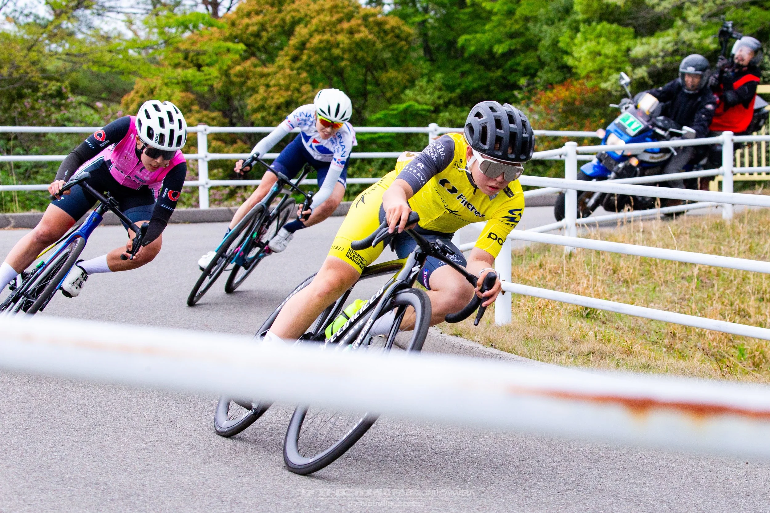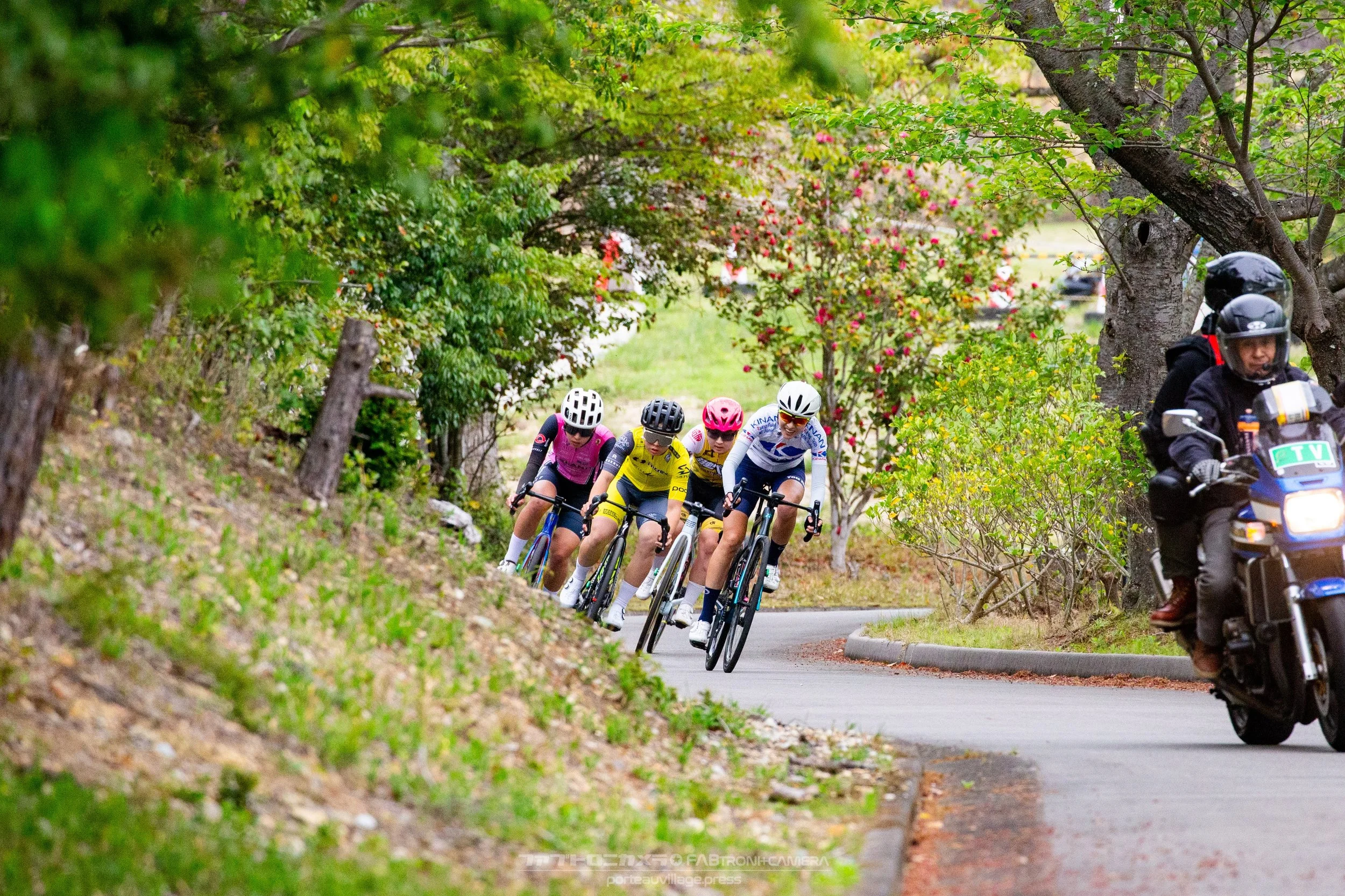 スタート直後、山下歩希(弱虫ペダルサイクリングチーム)、田中麗奈(IGNTZONE Racing Team) 、阿部花梨(イナーメ信濃山形-F)、金子広美(KINAN Racing Team MIE Junior)らが上りでペースアップし4名が先頭集団を形成。
