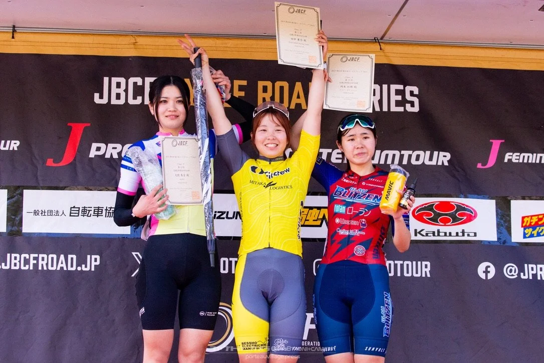 女子のJフェミニンツアーは12周72kmのレース。2周目から福山舞(湾岸サイクリング・ユナイテッド)がスルスルと単独先行し、後続の集団に最大1分差をつけた。